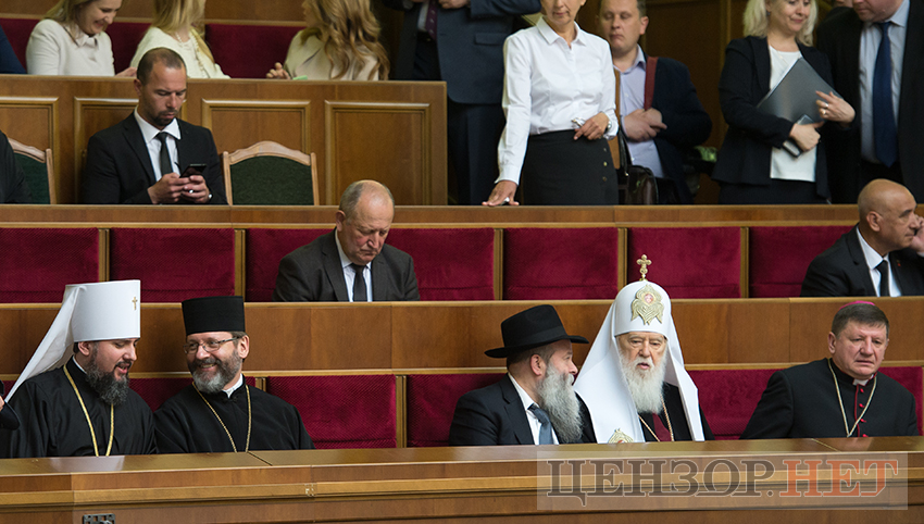 Лидеры религиозных общин пришли на инаугурацию Зеленского: митрополит Епифаний (ПЦУ, первый слева), архиепископ Святослав (УГКЦ, второй слева), почетный патриарх Филарет (ПЦУ, второй справа)