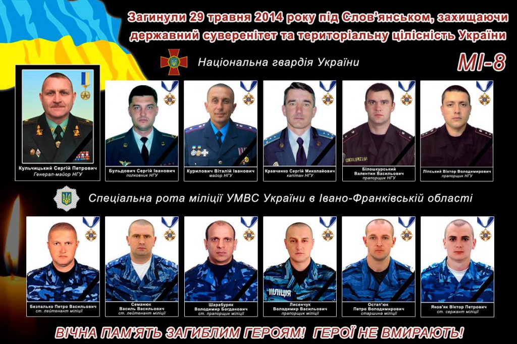 Во время падения взорвались топливные баки. В результате катастрофы погибли 12 человек - шесть военнослужащих Национальной гвардии, включая двух членов экипажа, и шесть представителей спецподразделения МВД Украины.