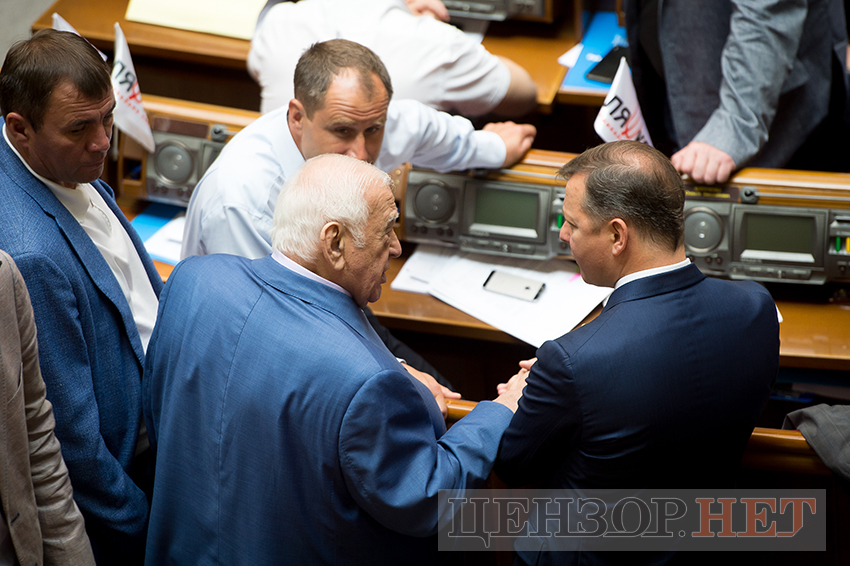 Глава фракции Радикальной партии Олег Ляшко пришел в сектор "Оппоблока" поговорить к "юристу Ахметова" Юрию Воропаеву ("Оппоблок") и поздороваться с Сергеем Матвиенковым ("Оппоблок").