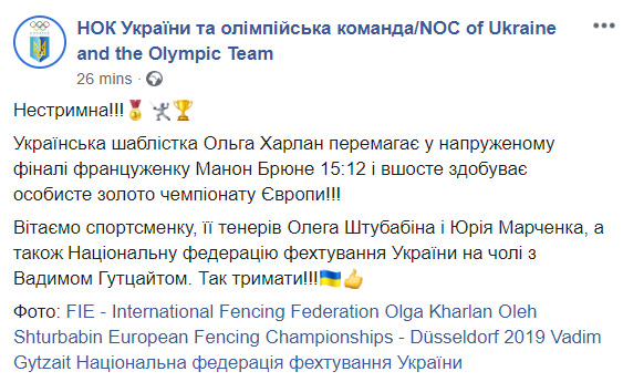 Как сообщает Цензор.НЕТ со ссылкой на facebook-страницу НОК, украинская саблистка Ольга Харлан победила в напряженном финале француженку Манон Брюне 15:12.