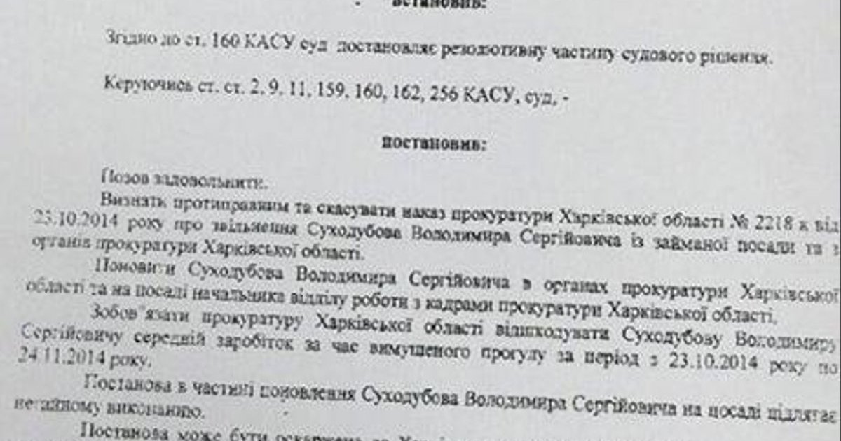 Своим решением суд обязал немедленно восстановить Владимира Суходубова в должности начальника отдела по работе с кадрами прокуратуры Харьковской области.