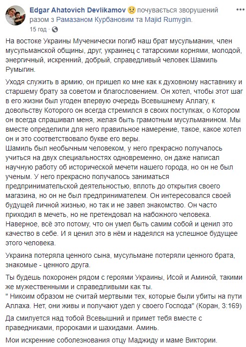 Имам Днепра Эдгар Девликамов на своей странице написал: "На востоке Украины мученически погиб наш брат мусульманин, член мусульманской общины, друг, украинец с татарскими корнями, молодой, энергичный, искренний, добрый, справедливый человек Шамиль Румыгин.