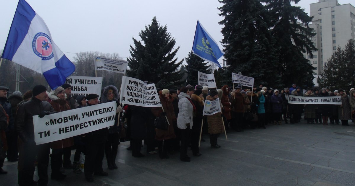 4 декабря несколько сотен учителей и их профсоюзные лидеры, которые представляют почти все районы области, провели акцию протеста перед зданием Тернопольской облгосадминистрации и облсовета. По информации корреспондента ZN.UA, причиной протеста стало то, что в пяти районах области - Тернопольском, Козивском, Лановецком, Подволочиском и Бережанском - из-за недостатка средств в местных бюджетах с сентября прекращена выплата 20-процентных надбавок за престижность педагогического труда, передает Цензор.НЕТ.