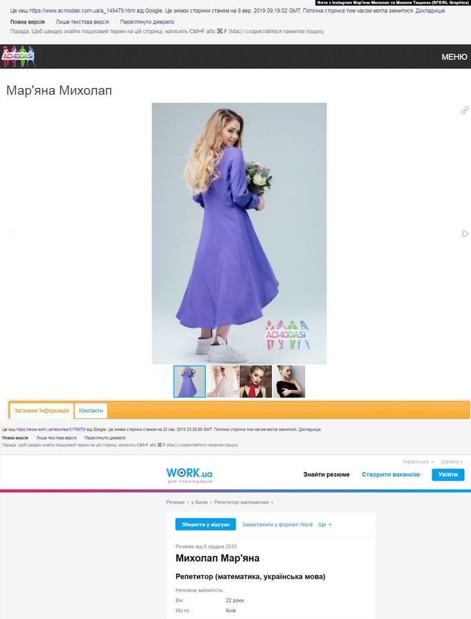 Еще учась в университете, Михолап искала работу репетитором математики и украинского языка. А еще предлагала свои услуги в качестве модели. В конце августа и в начале сентября 2019-го ее резюме об этом были удалены из соответствующих сайтов.