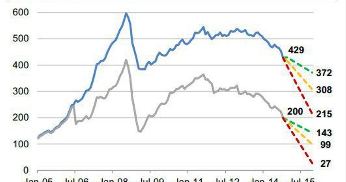 Если цена останется на среднем уровне в 80 долларов, резервы России уменьшатся до 308 миллиардов долларов, из которых только 99 миллиардов можно будет использовать. В случае обвала нефтяных котировок до 50 долларов за баррель, "живые" резервы РФ упадут до 27 миллиардов долларов. Их общее количество составит 215 миллиардов.