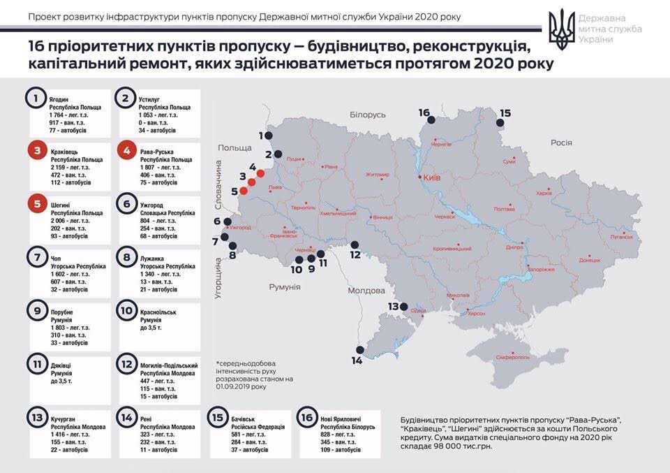 В течение следующих трех лет будут модернизированы 16 пропускных пунктов на украинской границе. 12 из них планируют открыть уже в следующем году. Все пункты пропуска оборудуют весовыми комплексами, большинство из них дополнительно хотят оснастить интегрированными системами видеонаблюдения.