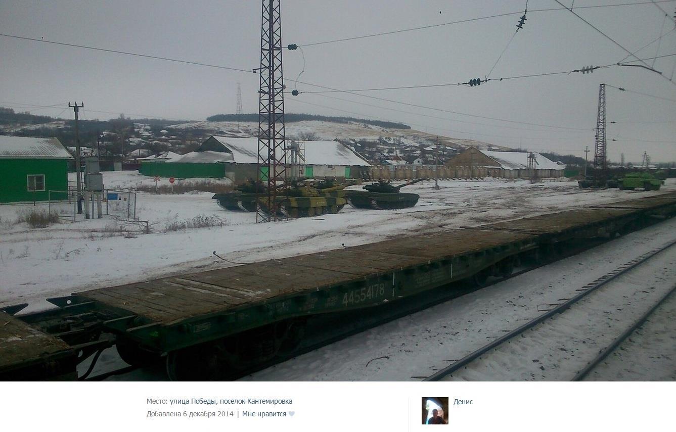 "Добыта свежая фотография с российскими танками на железнодорожной станции в приграничном с Луганской областью Украины (северо-восток) поселке Кантемировка Воронежской области РФ. Пока что не удалось идентифицировать их принадлежность к конкретной войсковой части, как и ответить на вопрос - это разгрузка или же погрузка. Надеюсь среди читателей найдутся железнодорожники, которые по номеру ж/д платформы "44554178" смогут о пределить точку отправки/назначения эшелона (раньше мне с этим помогали)", - просит блогер.