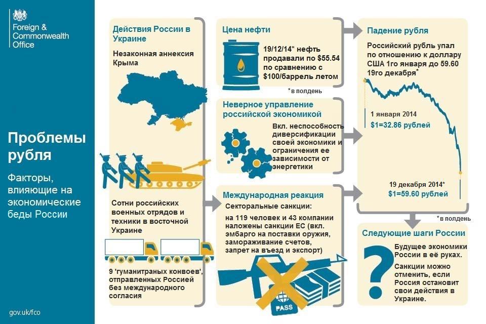 Как сообщает Цензор.НЕТ, эта инфографика представлена на twitter-странице посольства Британии в Украине. По мнению британских дипломатов, причиной падения рубля является прежде всего политика Кремля: незаконная аннексия Крыма, участие в военных действиях на Востоке Украины, а также формирование без международного согласования "гуманитарных конвоев". Последствиями этих действий стала негативная международная реакция. В частности, ЕС наложил санкции на 43 российские компании и 119 граждан РФ.