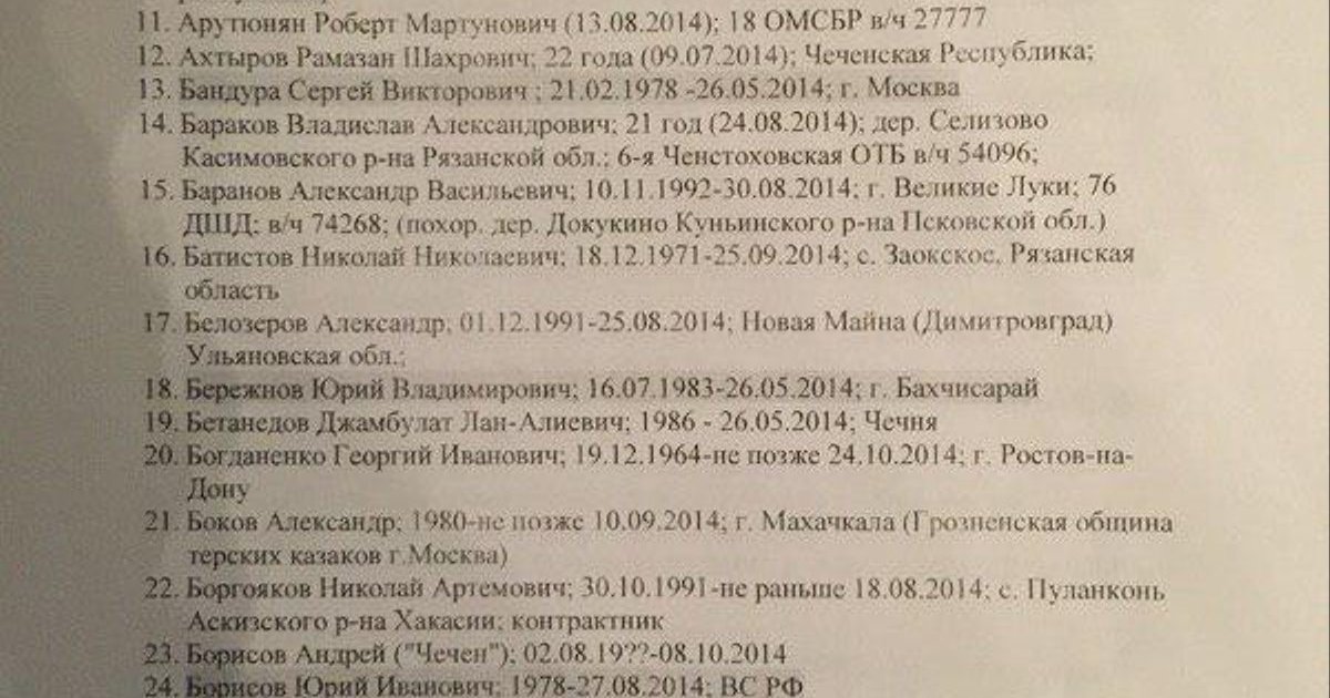 В интернете появился список российских солдат, офицеров и наемников, предположительно погибших в Украине в период с мая по ноябрь 2014 года.