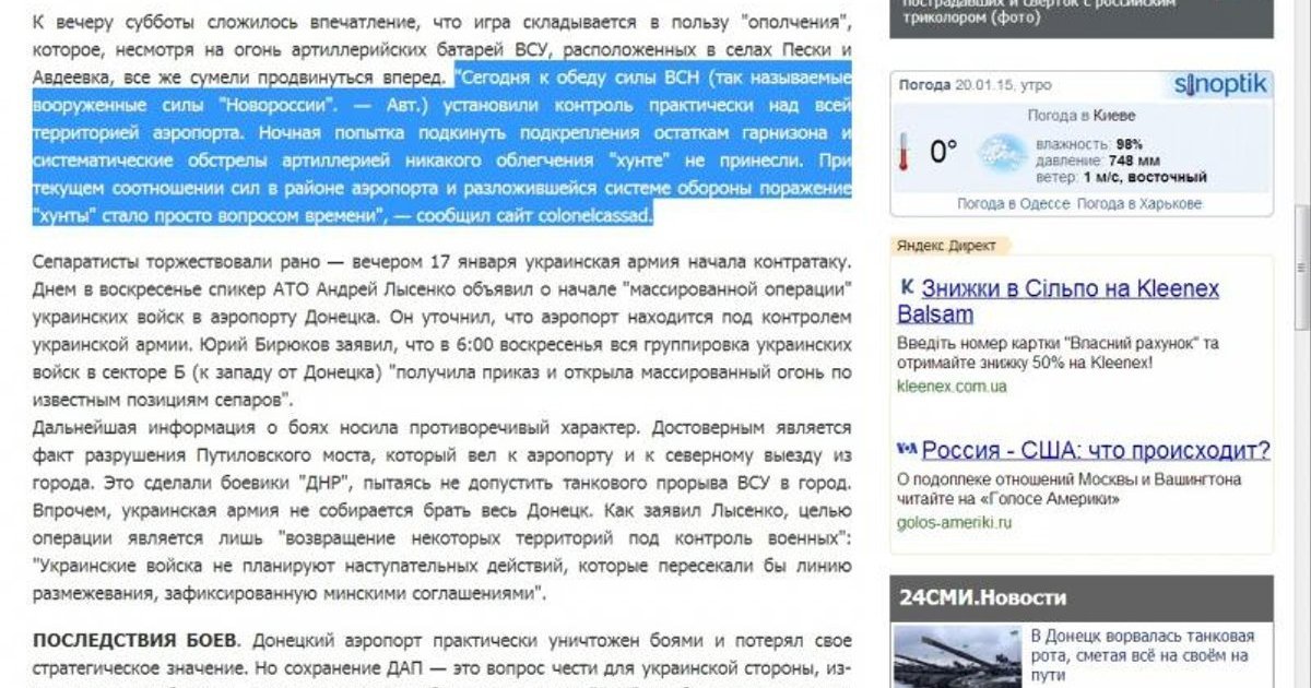 "В статье www.segodnya.ua/ukraine/voennyy-ekspert-voyna-na-vostoke-zashla-v-tupik-585476.html "Военный эксперт: война на Востоке зашла в тупик" можно прочитать вот такое: "Сегодня к обеду силы ВСН (так называемые вооруженные силы "Новороссии". - Авт.) установили контроль практически над всей территорией аэропорта. Ночная попытка подкинуть подкрепления остаткам гарнизона и систематические обстрелы артиллерией никакого облегчения "хунте" не принесли. При текущем соотношении сил в районе аэропорта и разложившейся системе обороны поражение "хунты" стало просто вопросом времени", - сообщил сайт colonelcassad.