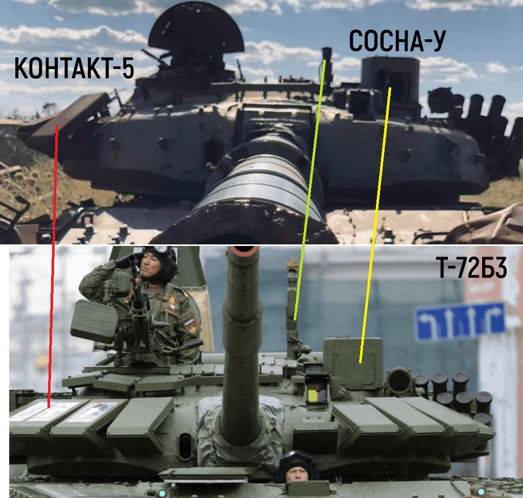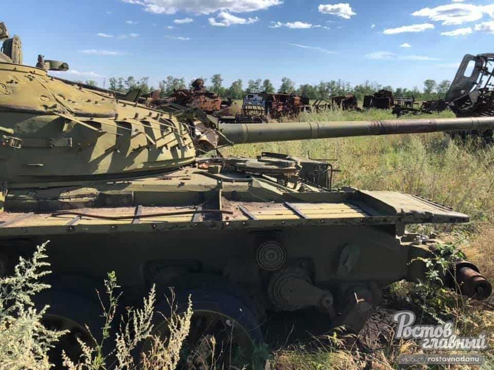 Также на фото можно опознать уничтоженный современный танк российской армии модели Т-72Б3. Он стоит на вооружении России с 2013 года. Характерной внешней особенностью танка Т-72Б3 является наличие динамической защиты Контакт-5, датчика ветра и современного прицела Сосна-У. Эти особенности Т-72Б3 можно увидеть и на фотографии уничтоженного танка в Ростовской области.