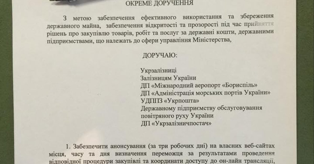 "Министр только что подписал Отдельное поручение центральным органам исполнительной власти, в том числе "Укрзализныце", аэропортам, АМПУ, "Украэроруху", проводить все тендерные закупки с онлайн трансляцией процедуры избрания победителя. Их руководители персонально отвечают за его неукоснительное выполнение", - написал Омельян.