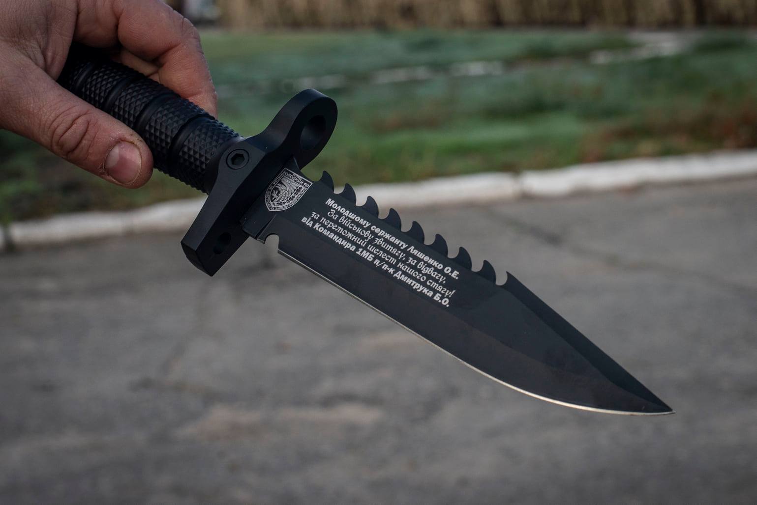Кроме того, лучшим бойцам своего батальона Богдан Дмитрук вручил ножи с именной гравировкой. Впервые знаменитые "ножи Дмитрука" бойцы получили не в окопах на передовой, а торжественно, на построении, перед строем. Вручение этих ножей уже стало доброй традицией 1-го батальона.