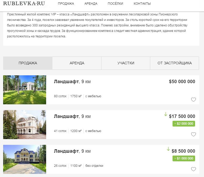 На сайте Рублевка.ру дома в поселке VIP-класса "Ландшафт" продают по цене от 4,5 до 50 миллионов долларов.