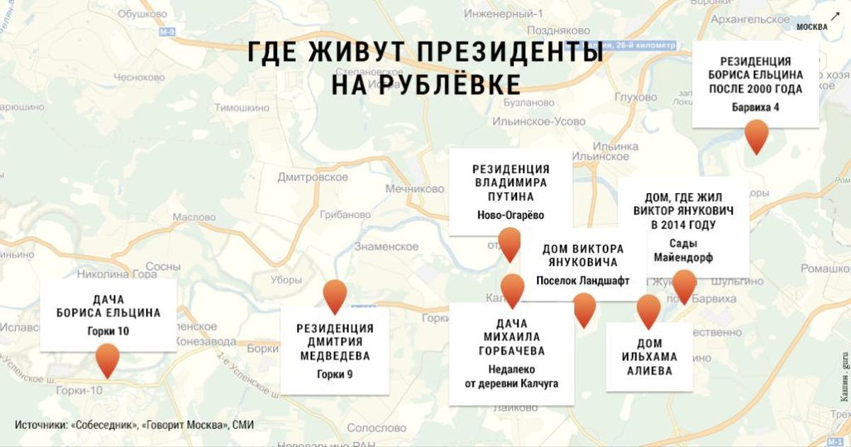 Издание "Кашин " в статье о Борисе Ельцине опубликовало карту под заголовком "Где живут президенты на Рублевке" - и на ней обозначен и дом Януковича, передает Цензор.НЕТ.