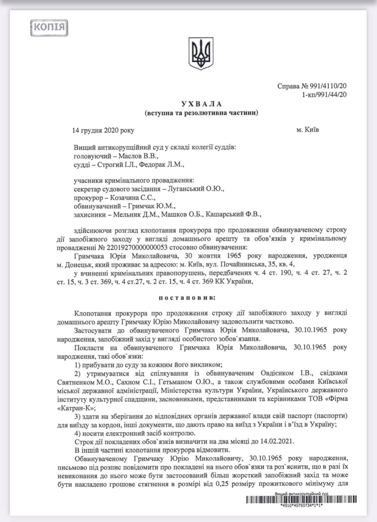 Он приложил к посту копию решения суда, в котором говорится, что Гримчак должен являться по каждому вызову, избегать общения с другими подозреваемыми, работниками КГГА, Минкульта и Украинского государственного института государственного наследия, сдать свой загранпаспорт и носить электронный браслет.