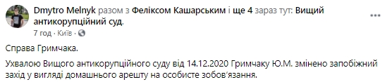 Об этом сообщил в Facebook адвокат Гримчака Дмитрий Мельник, информирует Цензор.НЕТ.