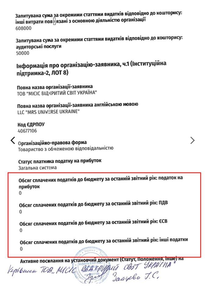 Украинский культурный фонд предоставил грант в размере 861 тыс. гривен в качестве покрытия потерь от коронавируса ООО "Миссис открытый мир Украина", которая, согласно обнародованным данным, за 2 года не уплачивала никаких налогов, не несла расходов и не имеет в штате сотрудников.