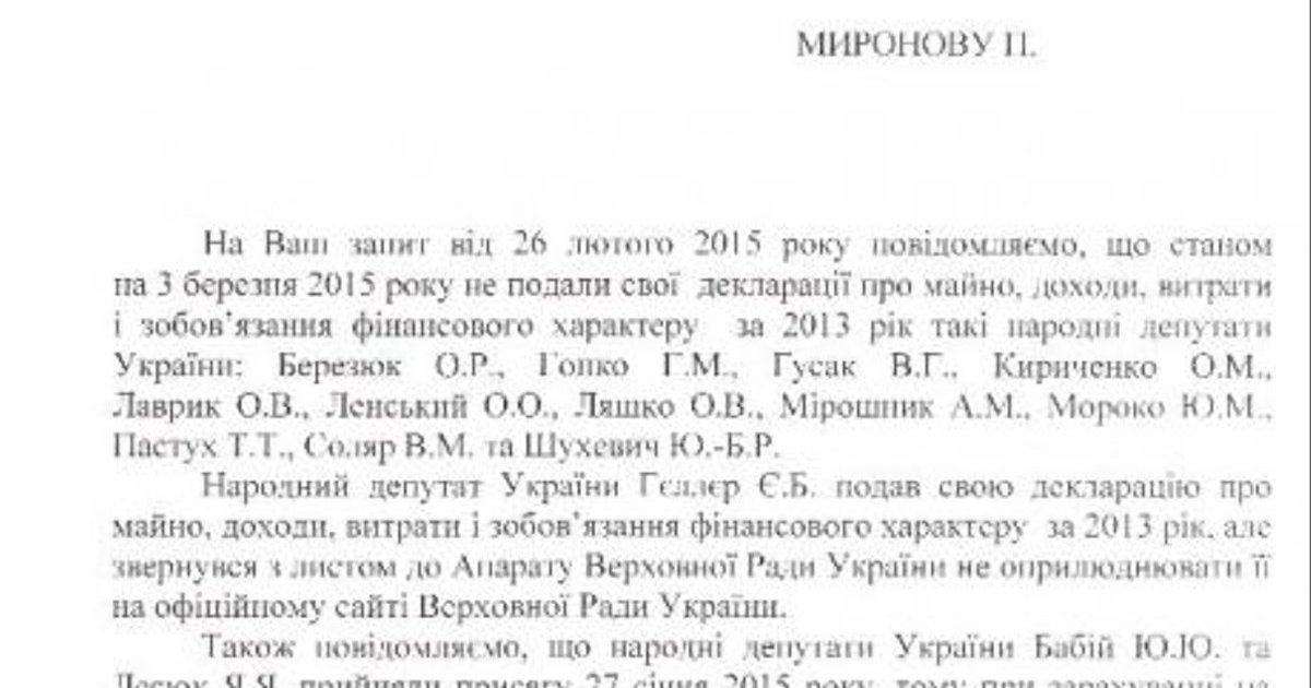 "Народный депутат Геллер Е. Б. подал свою декларацию об имуществе, доходах, расходах и обязательства финансового характера за 2013 год, но обратился с письмом к Аппарату Верховной Рады не обнародовать ее на официальном сайте ВРУ", - говорится в ответе.