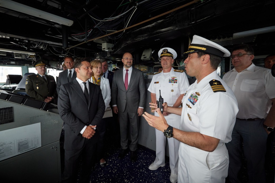 Во время рабочей поездки в Одесскую область Президент Украины Владимир Зеленский посетил эсминец "Росс" Военно-Морских Сил США, который участвует в международных военно-морских учениях "Си Бриз - 2021".