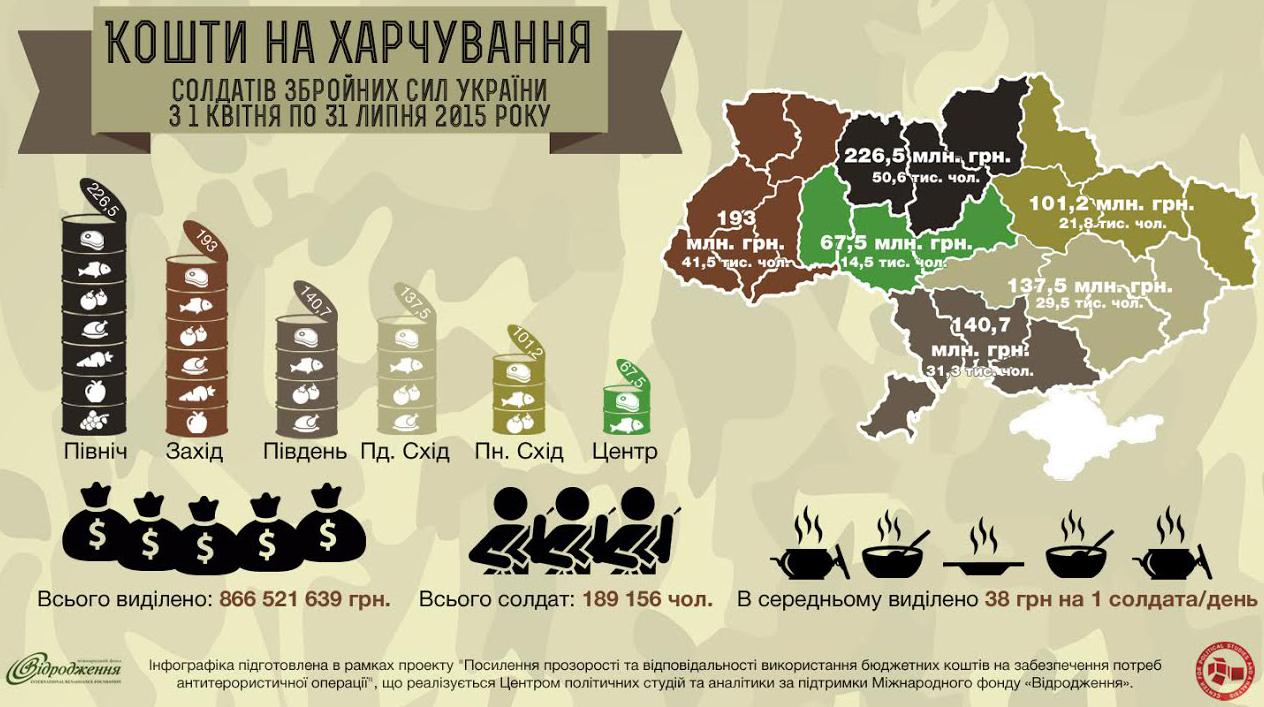 "В январе 2015 году министр обороны Степан Полторак отметил, что до 12 февраля состоятся открытые торги с привлечением представителей общественности, прессы и контролирующих органов, где выберут лучших организаторов питания армии. Действительно, на 10 февраля 2015 уже волонтерский Департамент государственных закупок МО объявил ряд торгов на питание вооруженных сил общей стоимостью более 866 500 000 грн. Контракты с потенциальными победителями планировали подписать на период с 1 апреля по 31 июля 2015 года с дальнейшим продолжением. Несложно подсчитать, что месяц организации питания для армии обойдется бюджету в 2015 году в 216 600 000 грн или 2 600 000 000 грн в год. За такие огромные деньги подрядчик должен будет кормить солдат в воинских частях по всей территории Украины и подвозить продукты в зону АТО в определенный пункт", - отметил автор.