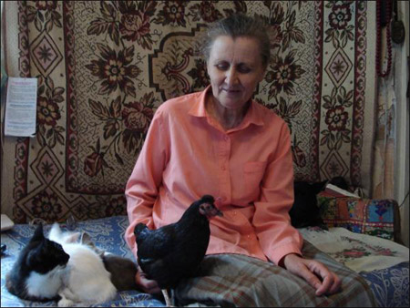 У супругов около десятка обычных кур. В дом пускают только Ганнусю. Наложили полотенец и сделали ей место для ночевки на печке. Когда на улице холодно — разрешают ночевать в доме. Зимой она отморозила лапы, поэтому хромает.