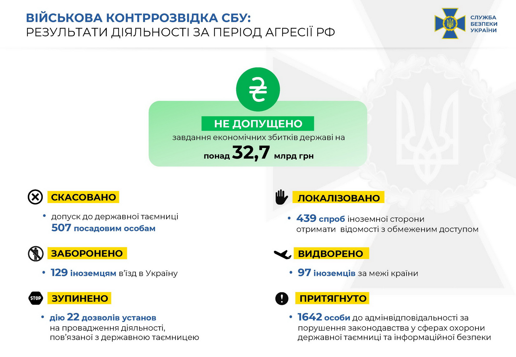 Военная контрразведка СБУ также противодействует коррупции и проявлениям организованной преступности в войсках. Благодаря этой работе с 2014 года было не допущено нанесение экономического ущерба государству в размере 32,7 млрд гривен.
