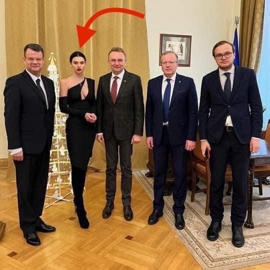 Отметим, что в украинских соцсетях обсуждают фото, на котором чиновники, в частности, заместитель министра образования Игорь Гарбарук и мэр Львова Андрей Садовый, в каком-то официальном кабинете стоят рядом с молодой женщиной в откровенном платье.
