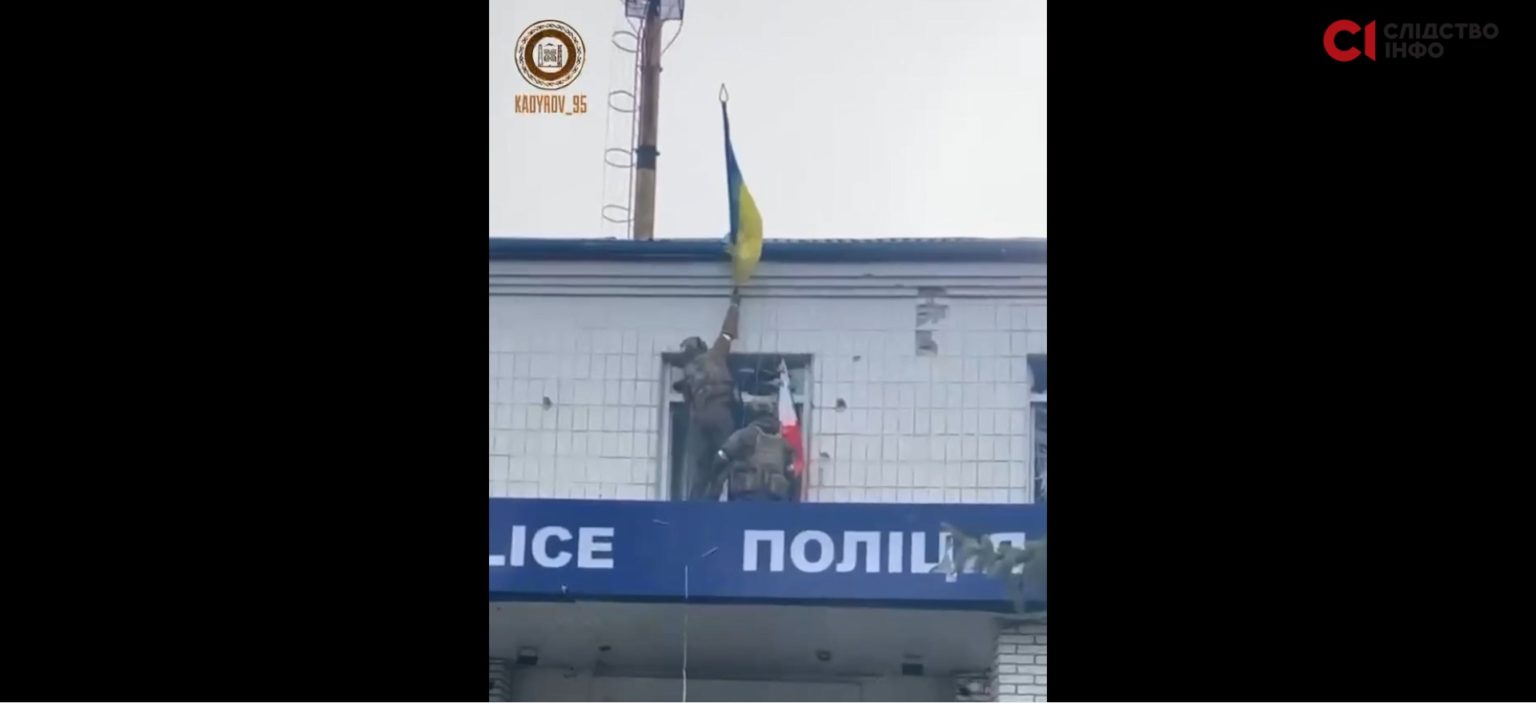 Так, 26 лютого у телеграм-каналі Рамзана Кадирова виклали відео, на якому командир чеченського батальйону "Південь" Хусейн Межидов знімає український прапор з воріт військової частини в Гостомелі і чіпляє прапори Росії та Чечні.