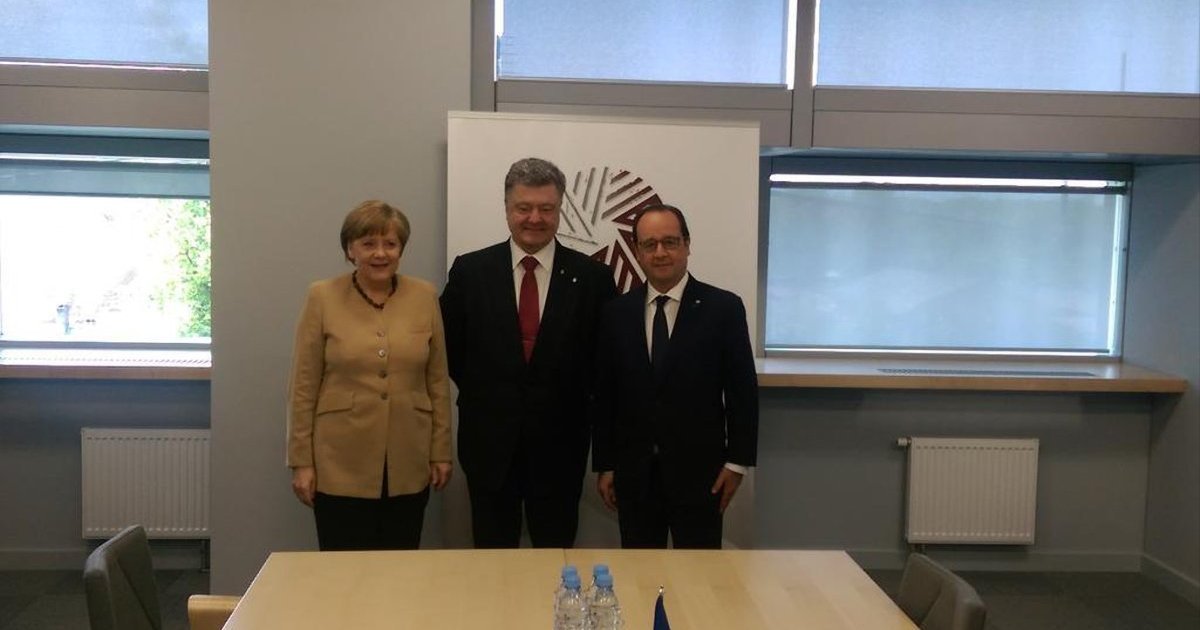 "На полях" саммита "Восточного партнерства" ЕС в Риге президент Украины Петр Порошенко проводит встречу с федеральным канцлером Германии Ангелой Меркель и президентом Франции Франсуа Олландом.