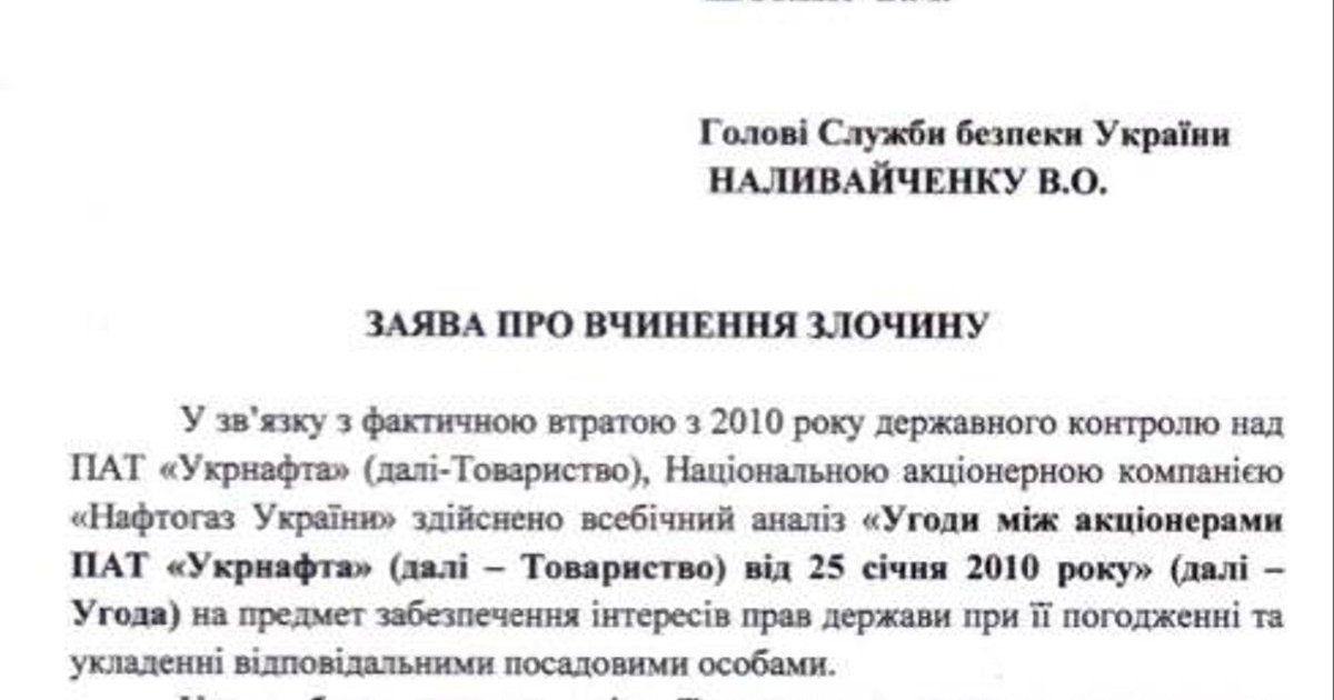 "Сегодня я направил в Генпрокуратуру по почте и вручил генпрокурору лично в руки "Заявление о преступлении" в связи с подписанием этого "акционерного соглашения", которым за Коломойским навечно закреплялось право назначать руководителя компании "Укрнефть". Потери государства в связи с заключением этого "акционерного соглашения" измеряются миллиардами гривен, если не долларов. Пора дать правовую оценку действиям тогдашнего премьер-министра и руководителя НАК "Нафтогаз Украины", - резюмировал Лещенко.