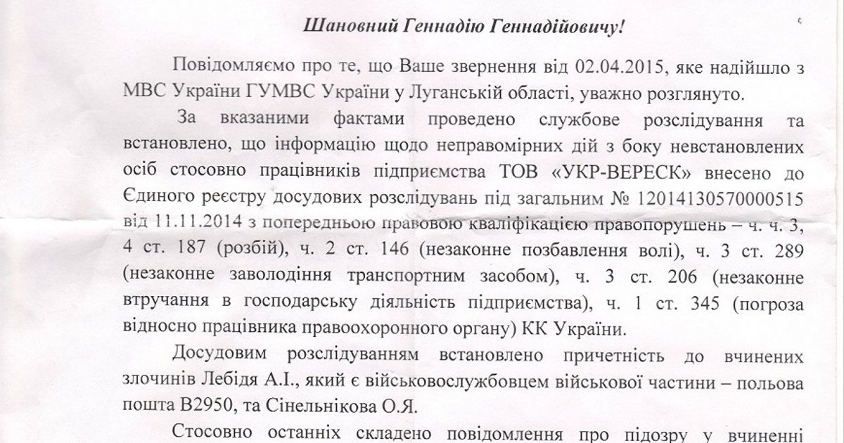 "За время захвата "Айдаром" хлебозавода нанесен ущерб более чем на 2 миллиона 400 тыс. гривень. Открыто уголовное производство по фактам разбоя, незаконного лишения свободы, незаконного завладения транспортными средствами, незаконного вмешательства в хозяйственную деятельность и угроз в отношении сотрудников правоохранительных органов. Инициаторы захвата завода - военнослужащий "Айдара" А.Лебидь, а также его соучастник О.Синельников (который был так называемым добровольцем, имел выданное руководством незарегистрированное оружие - АК, гранатомет, пистолет и т.д.) сбежали и объявлены в розыск", - заявил Г.Москаль.