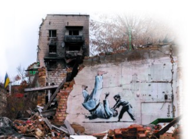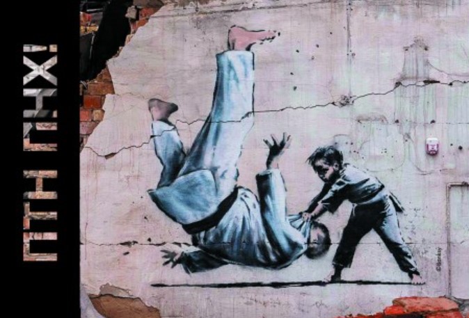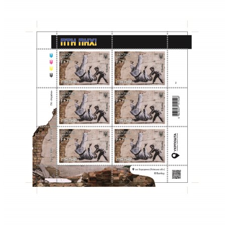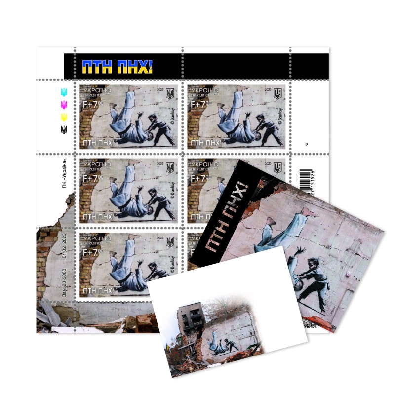 На почтовом выпуске представлен один из семи граффити всемирно известного уличного художника и политического активиста Бенкси, созданных им анонимно в Украине в 2022 году. Граффити с дзюдоистом, отправленным в нокаут, художник нарисовал на стене разрушенного дома в пгт Бородянка Киевской области.