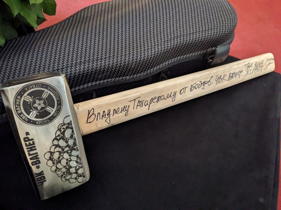 У гроба лежит кувалда – символ ЧВК "Вагнер". Ранее с помощью кувалды "вагнеровцы" казнили тех, кого считали предателями. На этом инструменте написано "Владлену Татарскому от бойцов ЧВК Вагнер. Твое дело живет!".