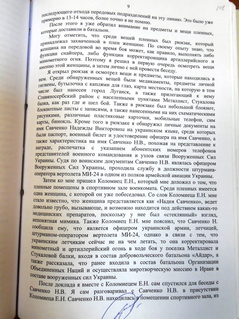 Так у меня следующие предметы и документы, которые были у Савченко Н.В. при себе в момент задержания в период боя в районе п.Металлист 17.06.2014: карта местности в районе поселка Металлист, паспорт на имя Савченко Н.В., водительское удостоверение на имя Савченко Н.В. ..."