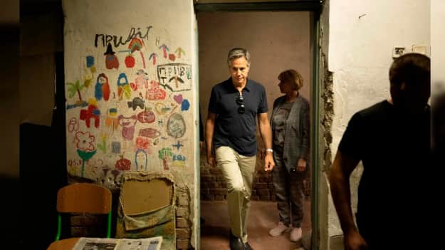 Госсекретарь США Энтони Блинкен посетил село Ягодное в Черниговской области, в котором российские оккупанты в школьном подвале удерживали несколько сотен гражданских.