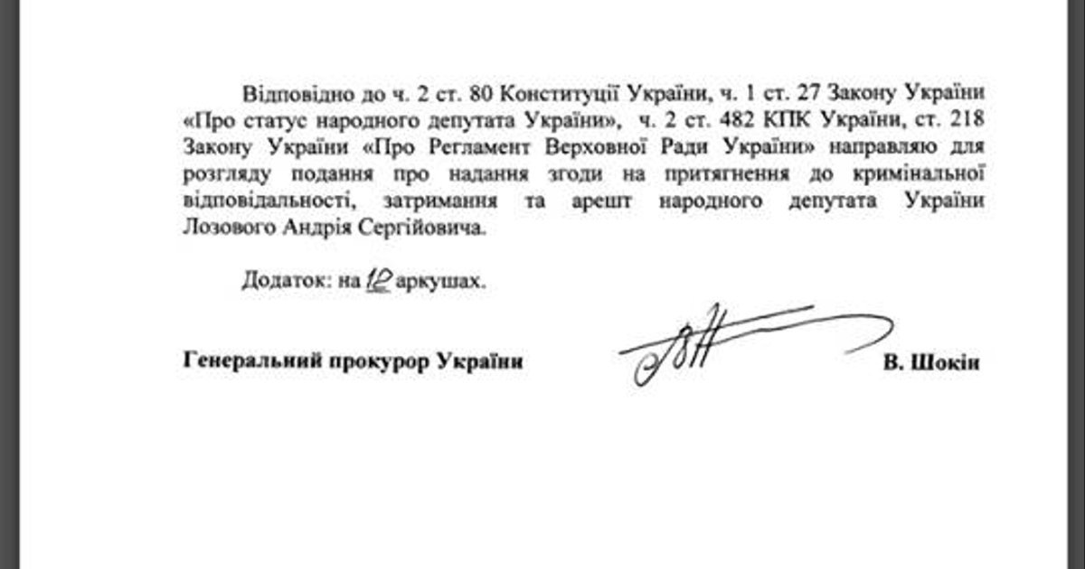 Глава фракции "Радикальной партии" Олег Ляшко опубликовал текст представления ГПУ на снятие депутатской неприкосновенности с депутата Андрея Лозового.