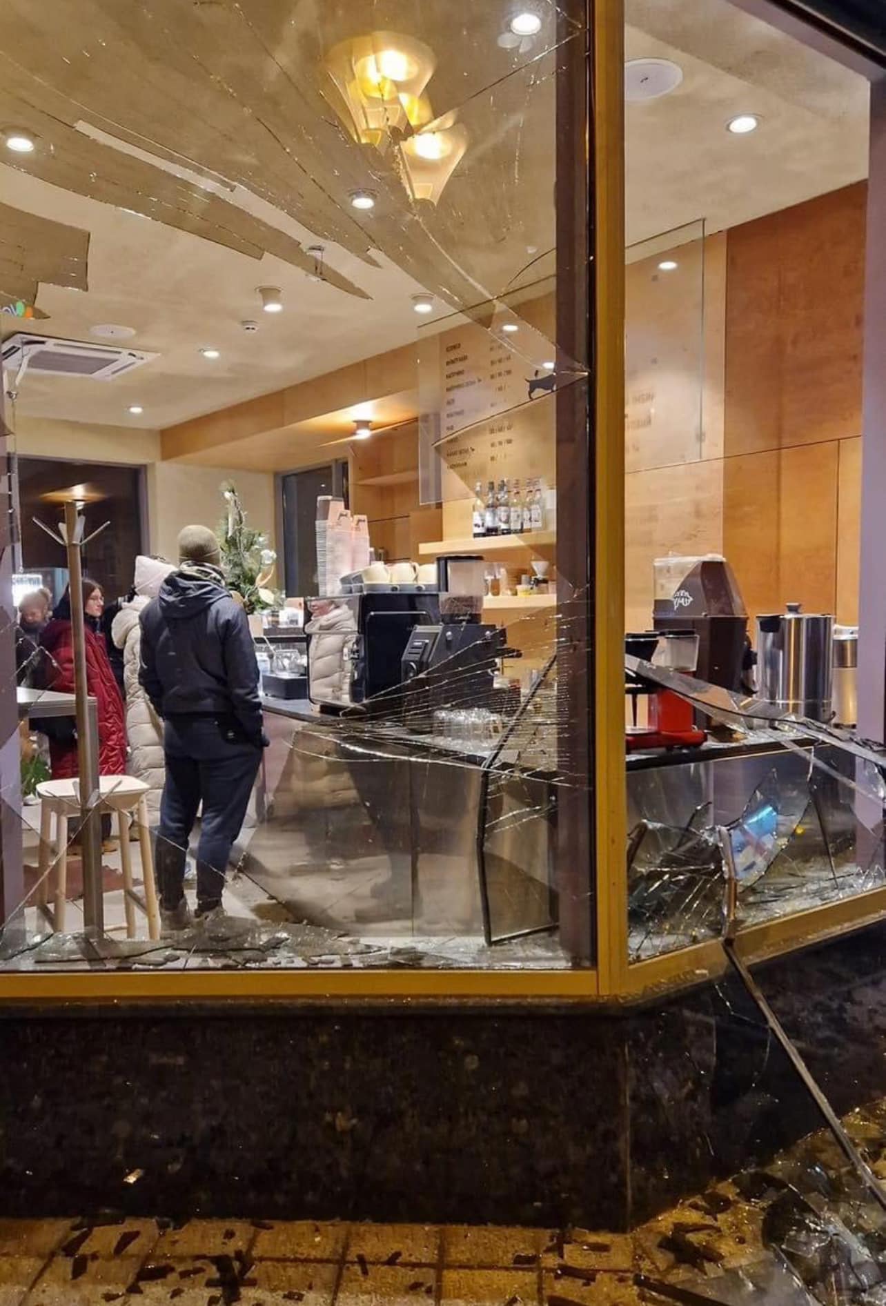 На фотографии видно, что от взрывной волны большие панорамные окна кафе разбились. Снаружи лежали обломки стекла. Внутри же горел свет и выглядел вроде бы обычно: люди даже выстроились в небольшую очередь, чтобы выпить кофе.