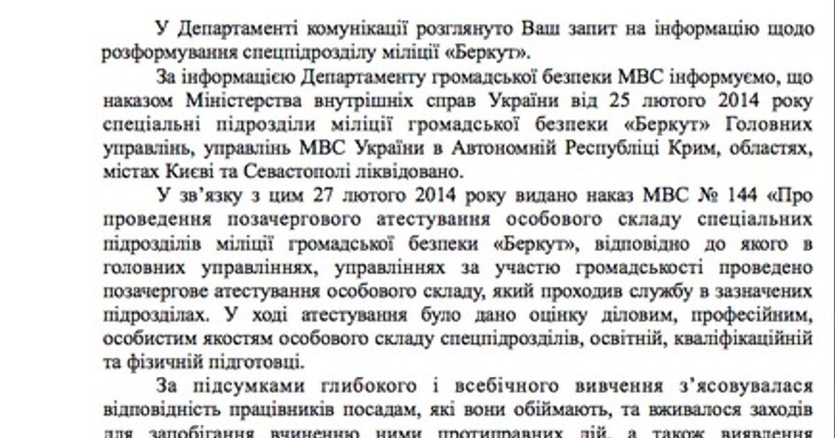 Большинство бывших сотрудников "Беркута" продолжают службу в МВД. ДОКУМЕНТ