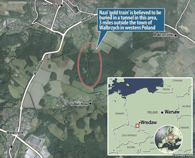 Ранее сообщалось, что польские власти и полиция проверяют информацию об обнаружении поезда с золотом нацистов, который, по легенде, пропал где-то в пригороде польского Вроцлава в 1945 году. Польские СМИ ранее сообщили, что двое граждан Польши обнаружили поезд и сообщили об этом одной из юридических фирм. Они уверяют, что вагоны полны золота, драгоценностей и оружия. Но за координаты состава они хотят получить 10% от стоимости сокровищ, находящихся в нем.