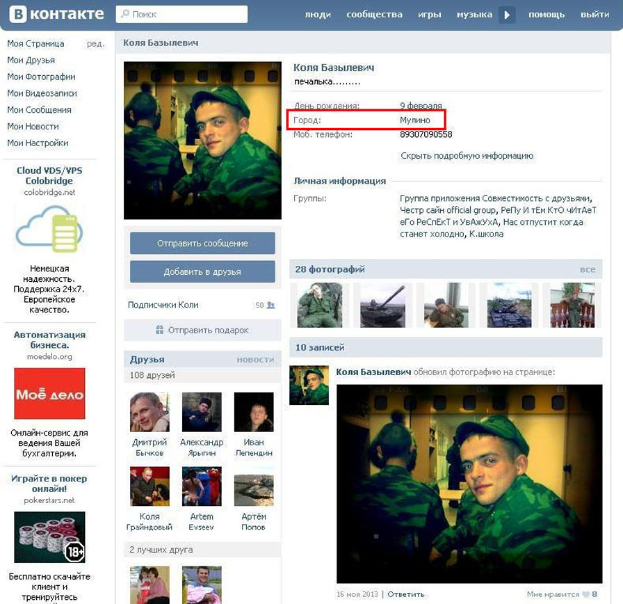 Так же посёлок Мулино - место дислокации 6-й танковой бригады, - указывает в своём профиле танкист Вадим Романюха (номер 12 на групповой фотографии):