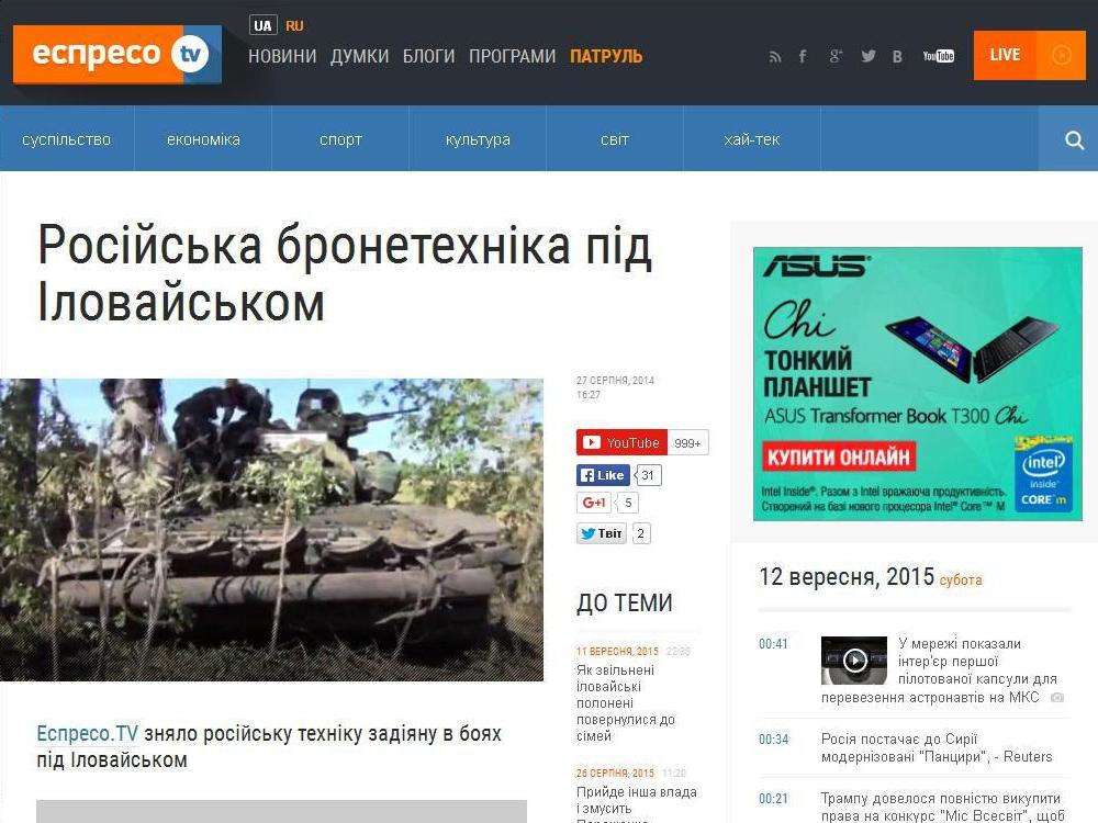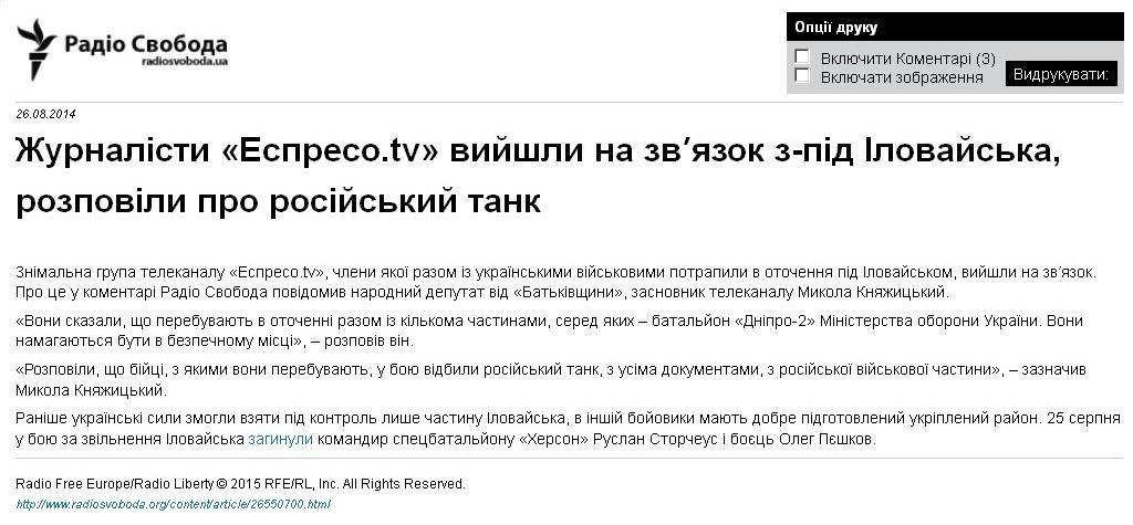 26-го августа - в тот же день, когда появились записи о смерти танкистов 6-й ОТБр, - информационная служба "Радио Свобода", ссылаясь на журналистов "Еспресо.tv", сообщает, что украинские солдаты "в бою отбили российский танк, со всеми документами, с российской военной части".