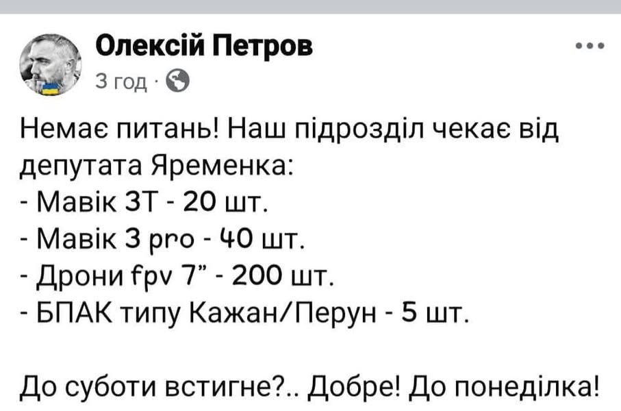 "Почти одновременно в плен двух северокорейских наемников захватила тактическая группа №84 CCО и 95 бригада ДШВ. Поэтому и вознаграждение, посоветовавшись, воины решили поделить поровну: по 10 ночных "Мавиков". Также везем РЭБы и другие "вкусности", необходимые нашим спецназовцам и десантникам", - отметил пятый президент.