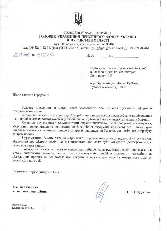 Такую информацию предоставил Луганский областной пенсионный фонд в ответ на соответствующий информационный запрос директора Департамента массовых коммуникаций ЛОГА Дениса Денищенко, передает Цензор.НЕТ со ссылкой на Четвертую власть."Из двенадцати членов совмина "ЛНР", которые числятся на учете в ПФ, не брезговали хунтовскими пенсиями пять человек. Двоих из них (Галинкина и Запорожцева) сняли с учета летом этого года, а остальные три "почетных" террориста пенсионного возраста, все же, пользуются услугами пенсионного фонда Украины. Задирака, Кукоев и Наден, стиснув зубы и зажав носы, мучаясь от подступившей тошноты, получают деньги, которые зарабатывают для них "укропопитеки", "фашисты", "салоеды", - прокомментировал полученную информацию Денищенко на своей странице в Фейсбуке.