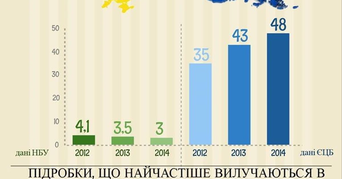 Для сравнения, согласно информации, размещенной на официальном сайте Европейского центрального банка, в странах Европейского Союза по итогам 2012 года этот показатель составлял примерно 35 шт. поддельных банкнот евро, в 2013 году - 43 шт., в 2014 - 48 шт.