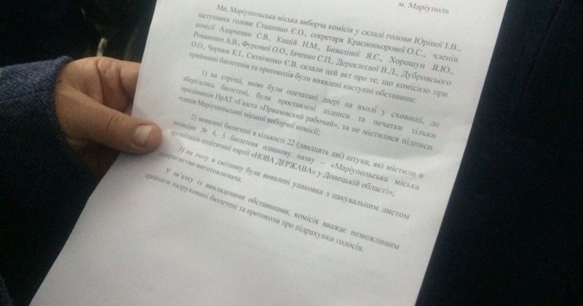 Об этом сообщает Цензор.НЕТ со ссылкой на Сайт города Мариуполя.Согласно акту, такое решение было принято из-за найденных разорванных бюллетеней, а также ошибках в них. Кроме того, дверь в хранилище была опечатана бумагой с подписями работников типографии, а не членов избирательной комиссии.