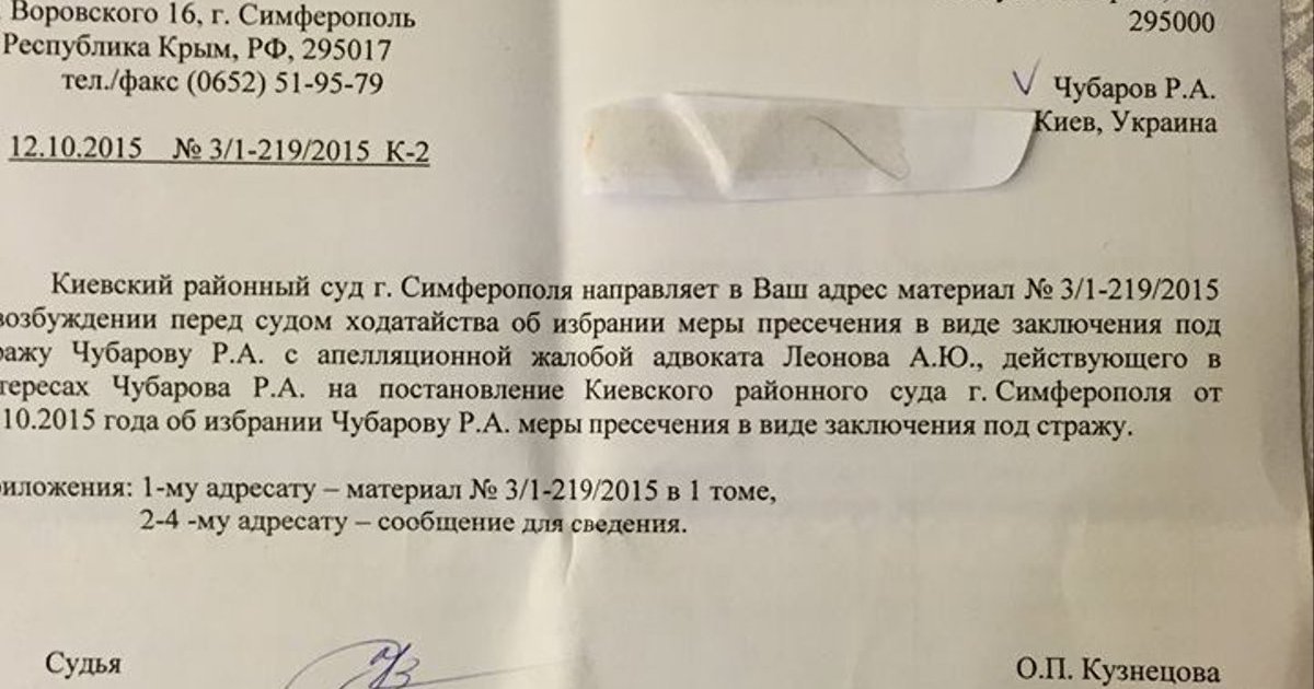 Об этом на своей странице в Фейсбук написал сам Чубаров, передает Цензор.НЕТ."Очередное послание оккупационных уродов…. Постановлением Киевского районного суда г. Симферополя от 06 октября 2015 мне, как "обвиняемому в совершении преступления, предусмотренного ч.2. ст. 280.1 УК РФ была избрана мера пресечения в виде содержания под стражей сроком до 2-х месяцев, исчисление которого определено судом с момента его экстрадиции на территорию Российской Федерации либо фактического задержания на территории Российской Федерации." Основанием для принятия указанного решения послужило обращение в суд Следственного отдела УФСБ России по Крыму и Севастополю. Как известно, статья 280.1 УК РФ гласит: "Статья 280.1. Публичные призывы к осуществлению действий, направленных на нарушение территориальной целостности Российской Федерации. Таким образом, Российская Федерация, оккупировавшая Крым, квалифицирует мои действия как гражданина Украины, пытающегося всеми законными способами и действиями способствовать деоккупации Крыма, преступными", - рассказал он.