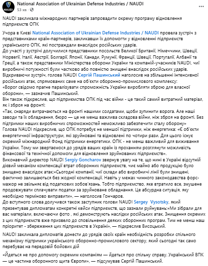 "Есть объекты энергетической инфраструктуры, которые разрушены и восстановлены по четыре раза. Для этого существует отдельный международный Фонд поддержки энергетики. ОПК - не менее важен для выживания Украины. Поэтому мы обращаемся к правительствам ваших стран с просьбой рассмотреть возможность финансовой и технической помощи для восстановления разрушенных предприятий", - добавил он.