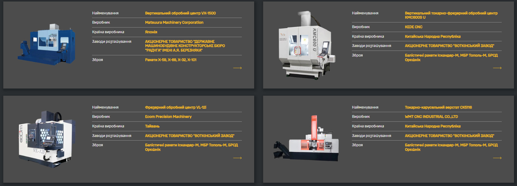 Также выявлено, что после начала полномасштабной войны ряд российских компаний поставлял "Воткинскому заводу" - производителю "Искандеров" и "Орешников" - китайские станки KEDE и WMT, а также тайваньские фрезерные обрабатывающие центры ECOM VL-12i.