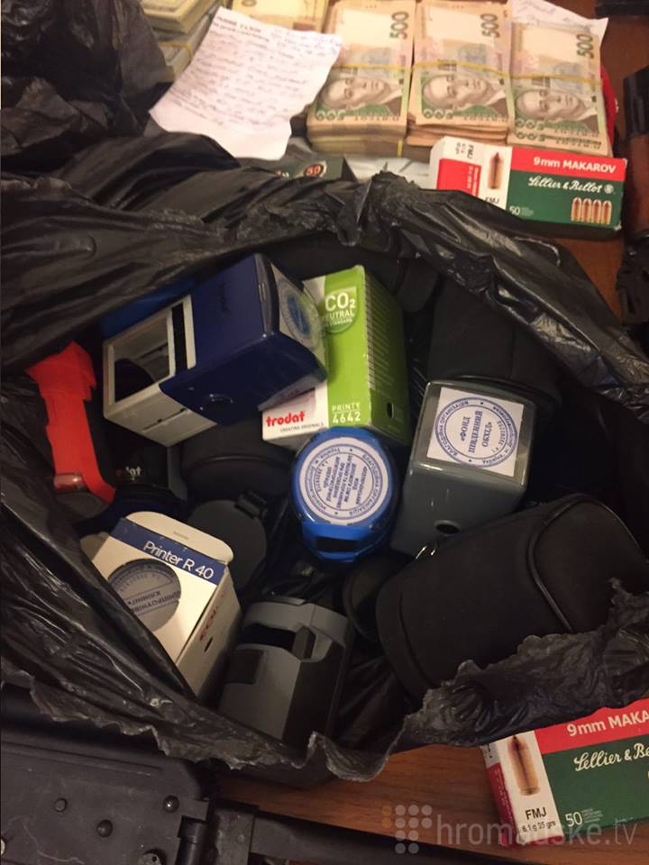 Об этом сообщает Цензор.НЕТ со ссылкой на Hromadske.TV.Были продемонстрированы изъятые во время обысков деньги, печати и оружие.